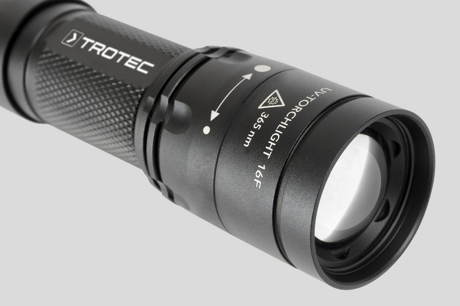 Unlike conventional UV torches, though, the UV-Torchlight 16F can not only be used in spotlight operation: An integrated focus ring enables the infinitely variable regulation of the UV-A radiation cone from spotlight to floodlight.
