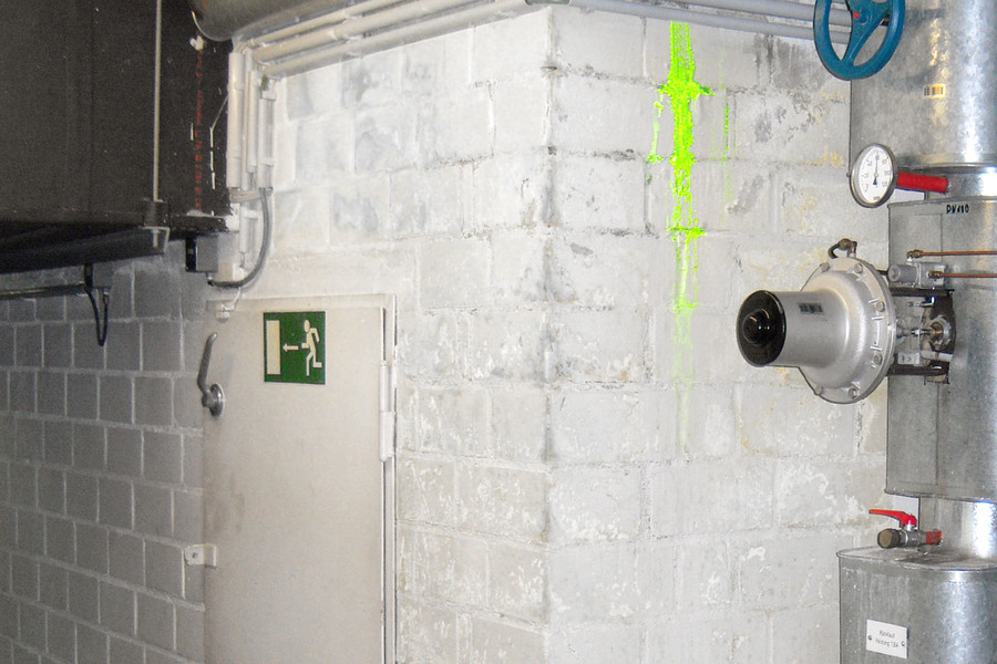 Depending on the tracer used, the test objects can be fogged with tracer aerosols, immersed in tracer liquid or dusted with tracer powders. Suitable tracers are, for example, water-soluble Uranin powder or Trotec Luminat, an eleven per cent anionic aqueous pigment dispersion, which can be diluted with water, but does not metabolize. This is particularly advantageous in case of leak detections on green roofs or when locating concealed leaky water-bearing pipes or drains. Due to its small pigment size of only 0.5 µm, Trotec Luminat penetrates even the smallest capillaries and is extremely yielding; depending on the field of application, a dilution at the rate of 0.3 to 3 % is sufficient.